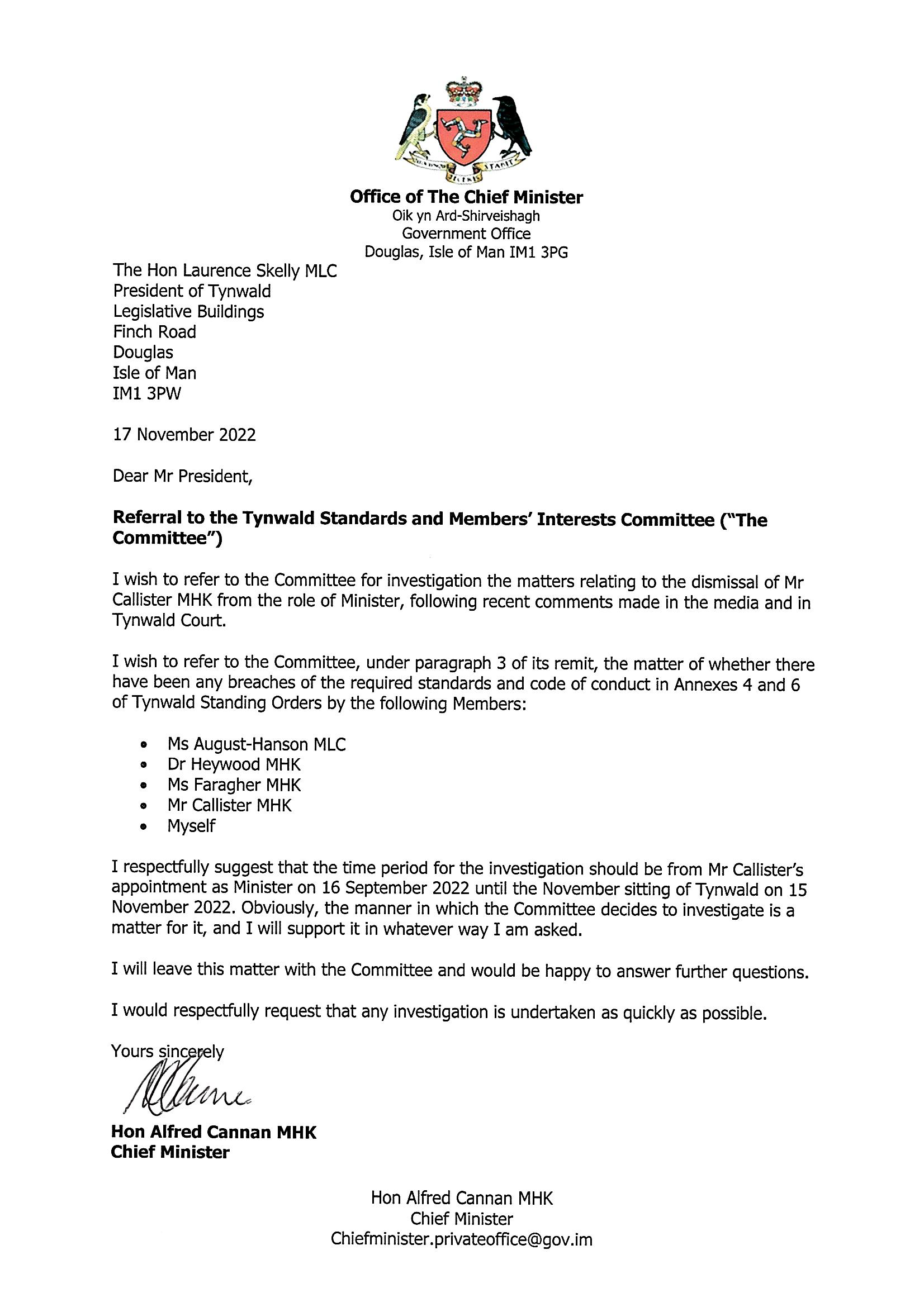 The chief minister has written to the Tynwald Standards and Members Interest Committee.